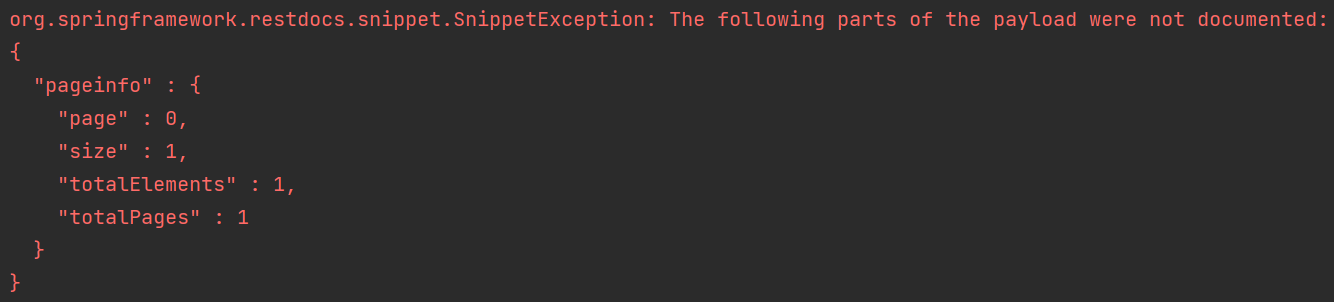 responseFields() 메서드에서 실제 response에 있는 "pageinfo" 필드에 대한 설명을 누락함.