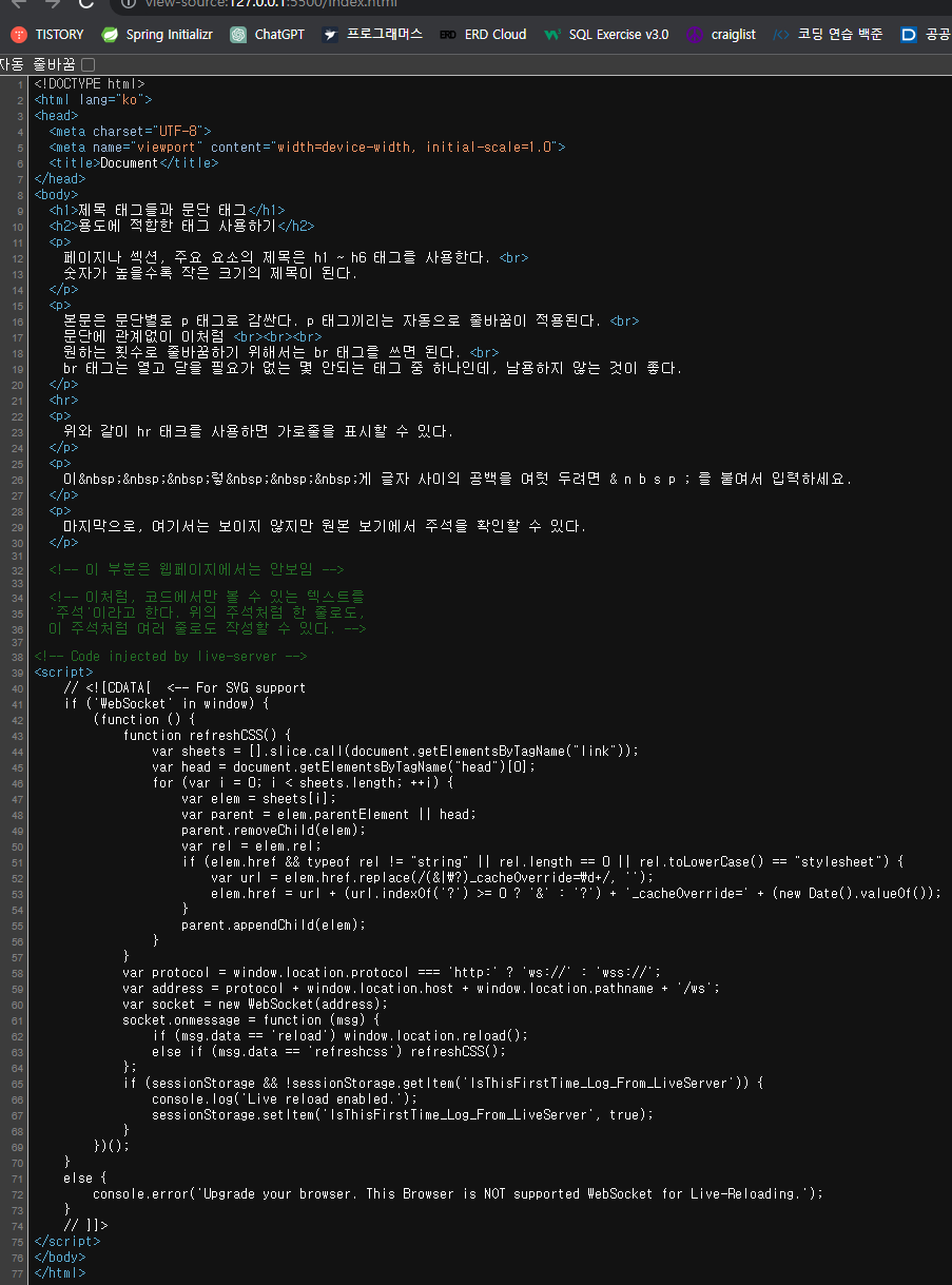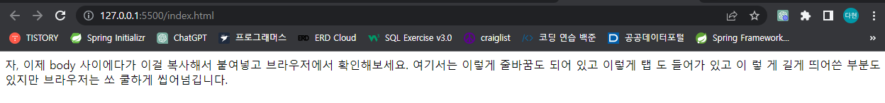 출력되는 웹페이지를 보면 한 문장으로 되어있다.