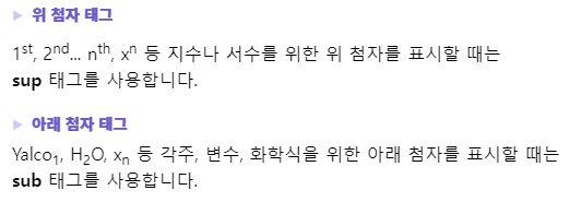 | <strong> </strong> | 중요한 내용임을 명시 (굵게 표현 포함) // strong {내용} + tab 작성 가능 |