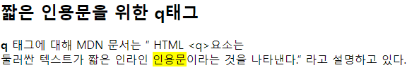 둘러싼 텍스트가 짧은 인라인 <mark>인용문</mark>이라는 것을 나타낸다.</q>