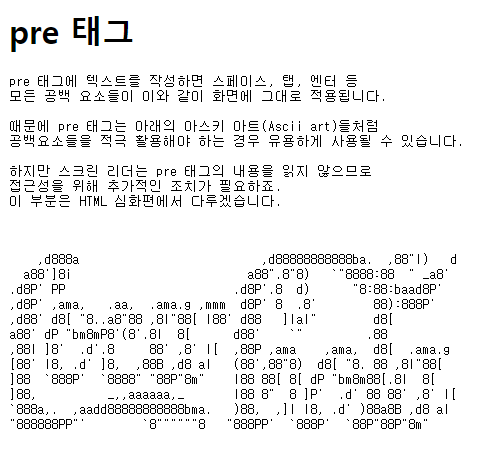 때문에 pre 태그는 아래의 아스키 아트(Ascii art)들처럼